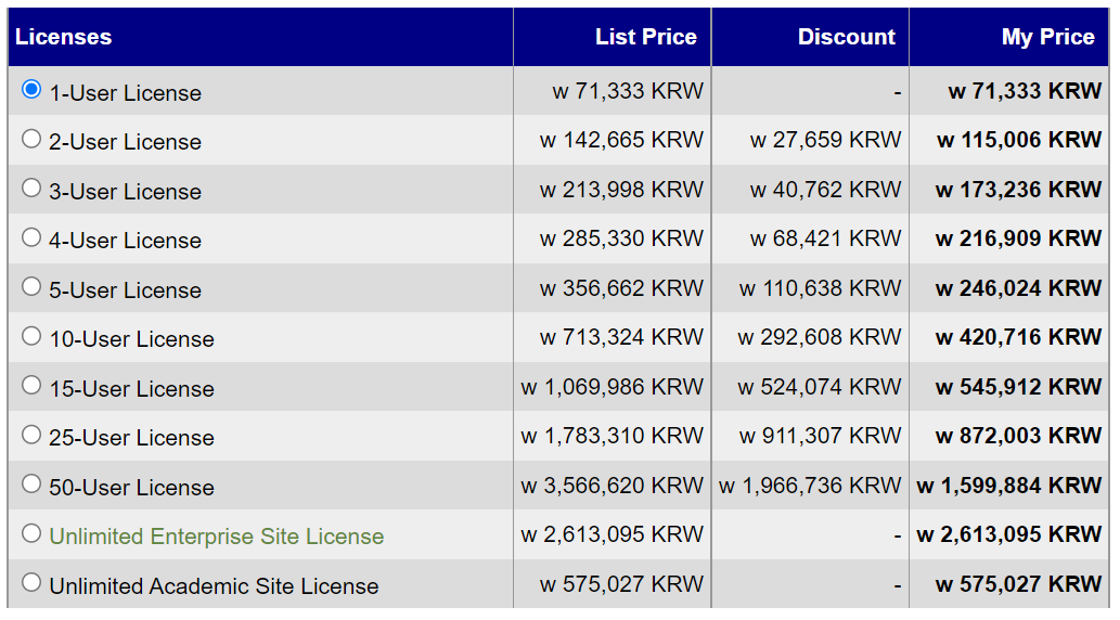 기본적인 가격정책은 위와 같습니다. 과거에는 홈페이지에서 달러화로 나왔는데, 최근에는 원화로 변경이 된것 같습니다. 제 기억이 맞다면 1 User 라이센스가 45불 정도로 기억합니다. 환율에 따라서 이 가격은 조금씩 달라질 것이라 생각이 됩니다.