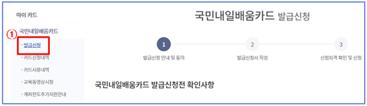 로그인이 완료된 상태에서 홈>마이서비스>마이카드>국민내일배움카드> 발급신청 으로 들어가시면 됩니다.