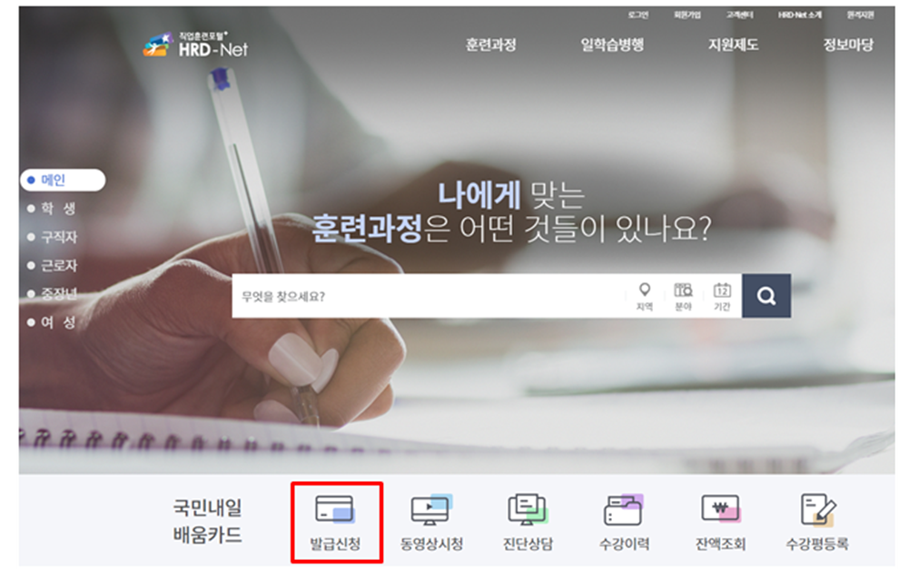 메인화면의 발급 신청 아이콘을 클릭을 하면 고용노동부 내일배움카드 신청이 가능합니다.