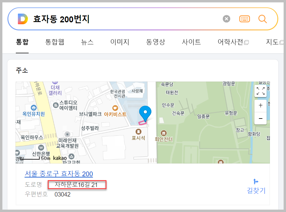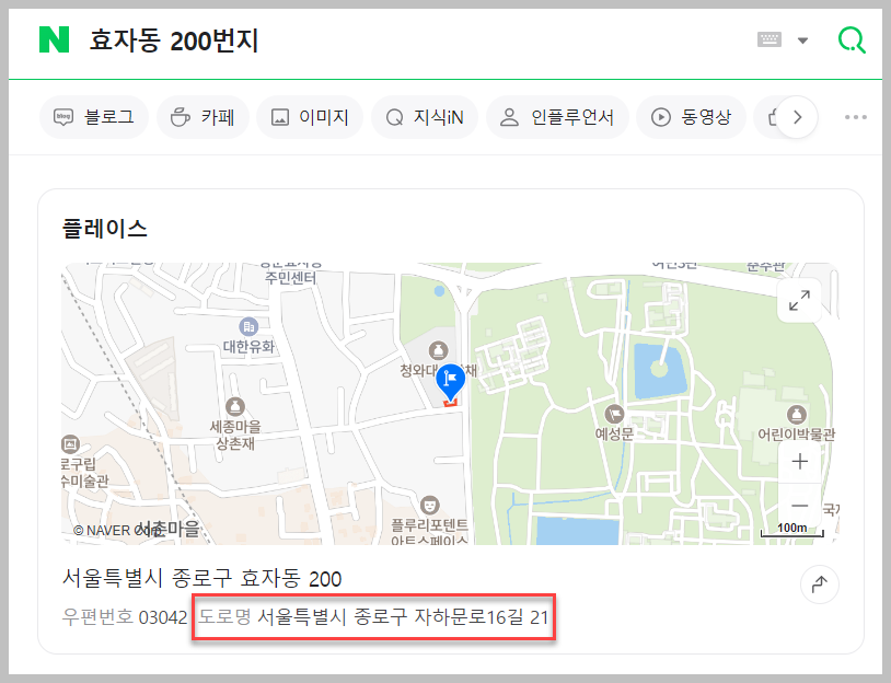 예를 들어 네이버 검색창에 ‘효자동 200번지’처럼 지번을 입력하면 자동으로 도로명주소가 함께 표시됩니다. 별도의 변환 사이트를 찾지 않아도 검색만으로 확인할 수 있습니다. 지도 화면과 함께 건물 위치도 보여 주기 때문에 정확하게 확인할 수 있습니다. 지번만 알고 있어도 충분히 새 주소를 찾을 수 있다는 점이 장점입니다.