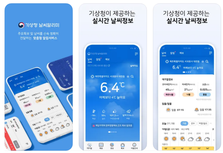 많은 날씨 앱이 있었지만 개중에는 기상청에서 만든 앱이 없었습니다. 하지만 최근에 직접 만든 앱이 만들어졌다고 합니다. 좋은 점은 역시 공공기관에서 직접 제공하는 정보라는 것과 불필요한 광고가 없다는 것이 가장 큰 장점이라고 생각됩니다.