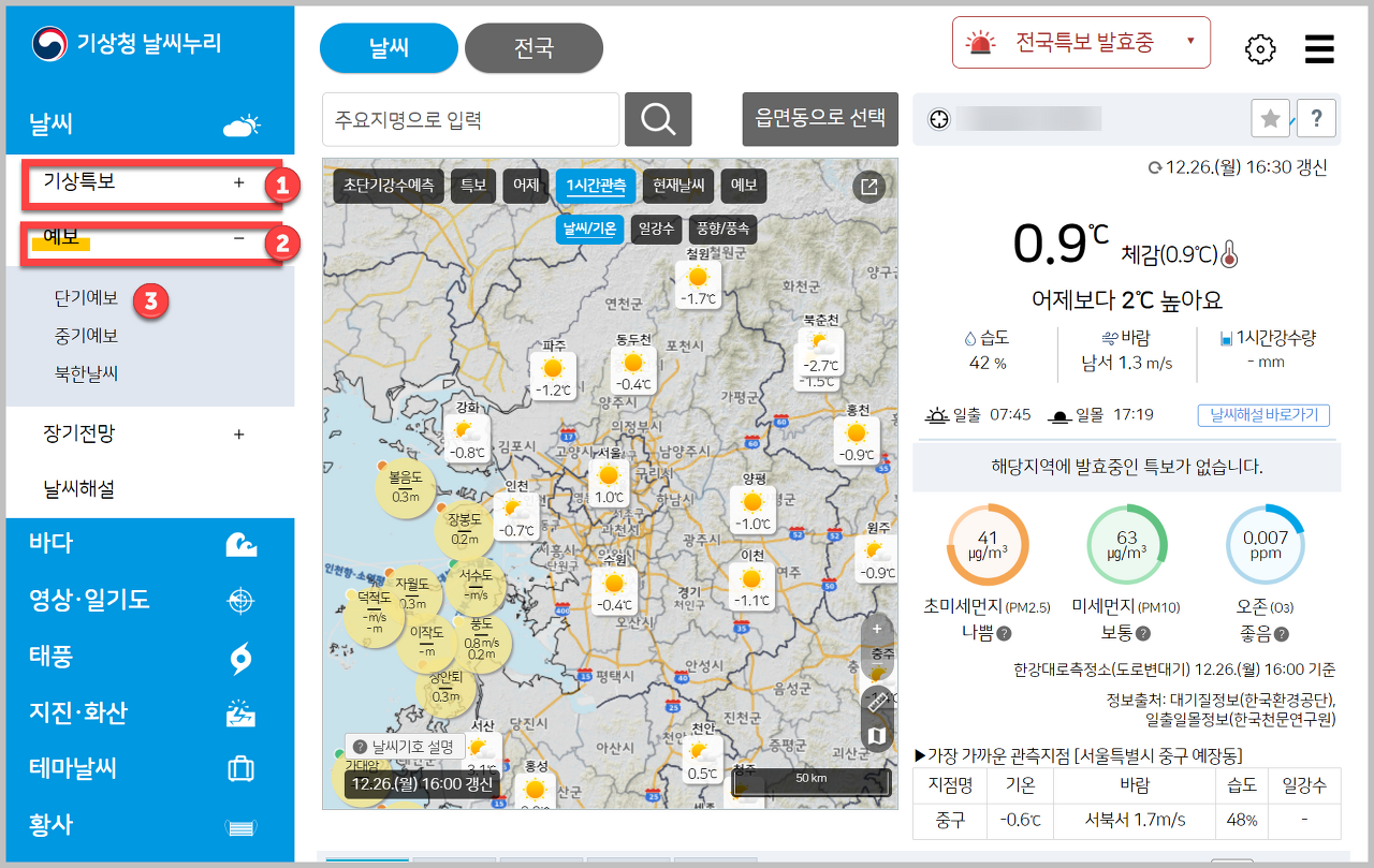 기상청 날씨누리 동네예보에 접속하면 다음과 같이 정보를 알 수 있습니다. 보통 단기예보에 들어가서 에보를 확인하는 것이 일반적이기 때문에 단기예보에 들어가는 방법은 특보-예보-단기예보에 접속하는 순서입니다.