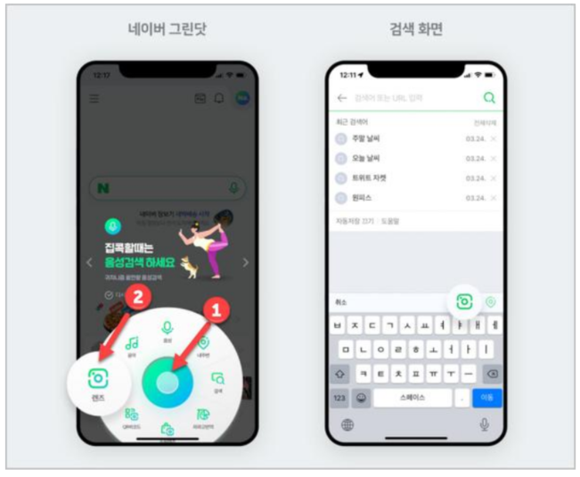 먼저, 네이버 앱이 필요합니다. 앱을 열고 화면 중앙에 위치한 초록색 점을 누른 후 '렌즈'를 선택합니다. 그러면 스마트렌즈 화면이 나타납니다.