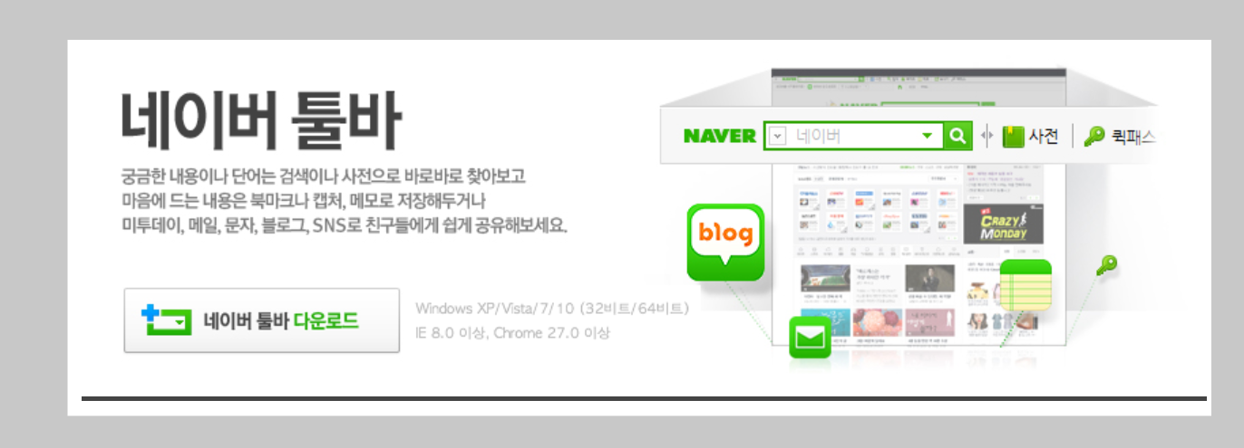 네이버나 다음과 같은 포털에서 검색해서 들어가실 수 있지만 위의 링크로 들어가시면 네이버 툴바를 다운로드 할 수 있는 화면으로 들어가실 수 있습니다.