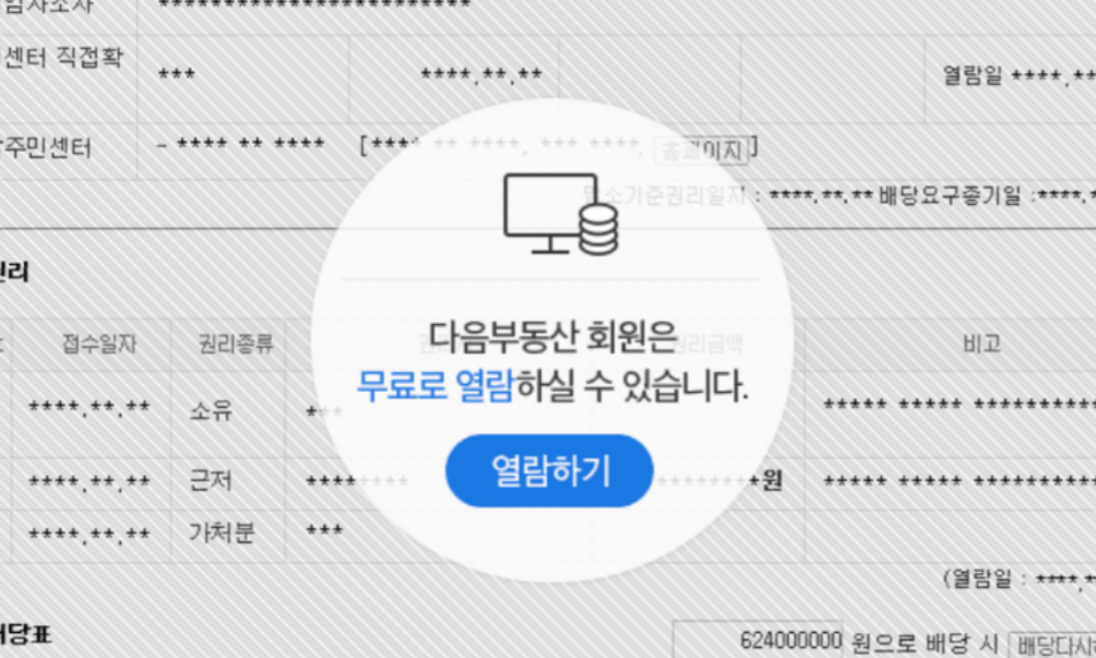 다음 부동산 회원은 무료로 열람할 수 있다고 되어 있는데, 이게 3회만 가능한것입니다. 임차관계, 등기권리, 예상배당표, 임차인 예상배당표 등을 확인할 수 있습니다.