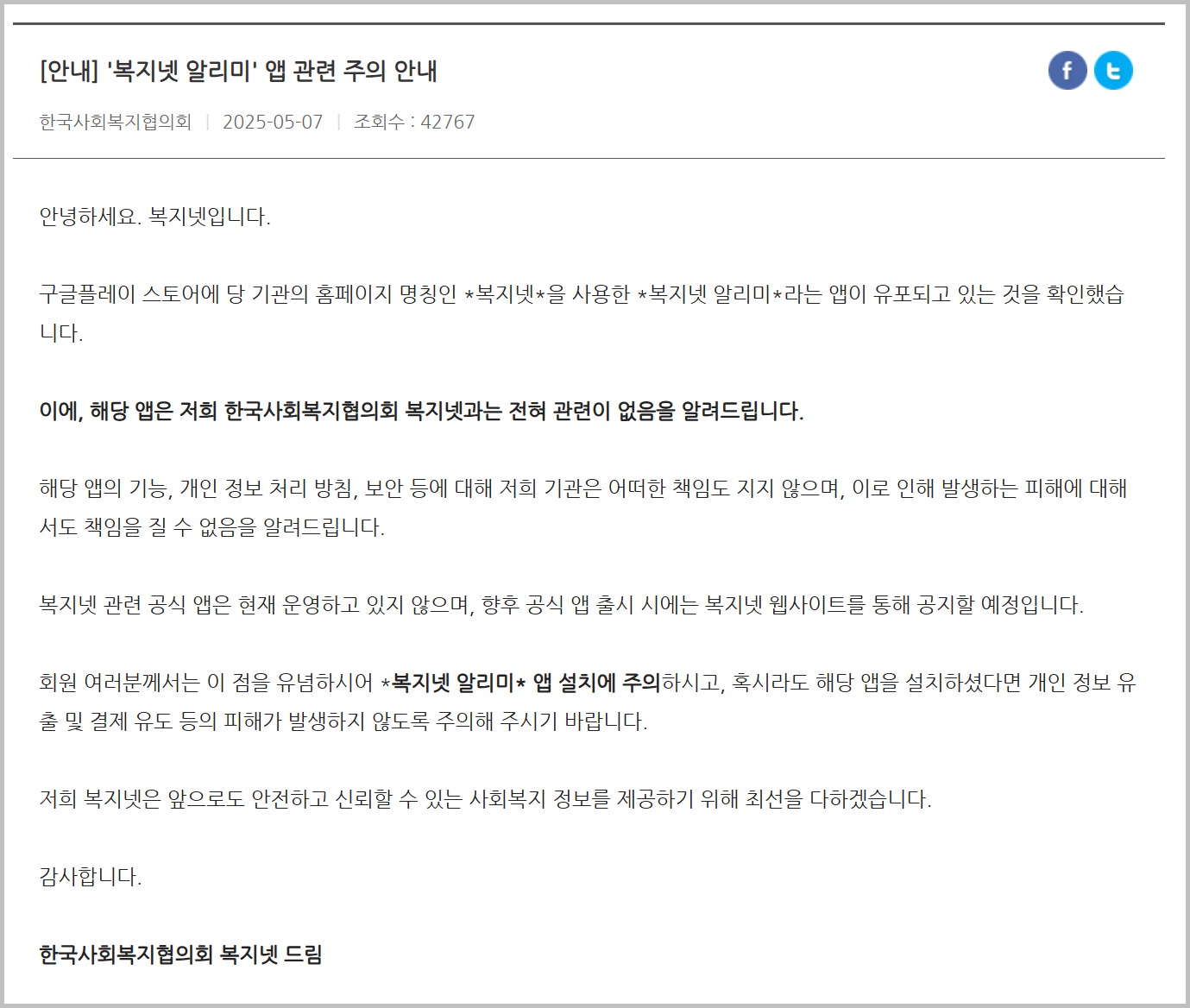 - ‘복지넷 알리미’는 공식 앱이 아니다.