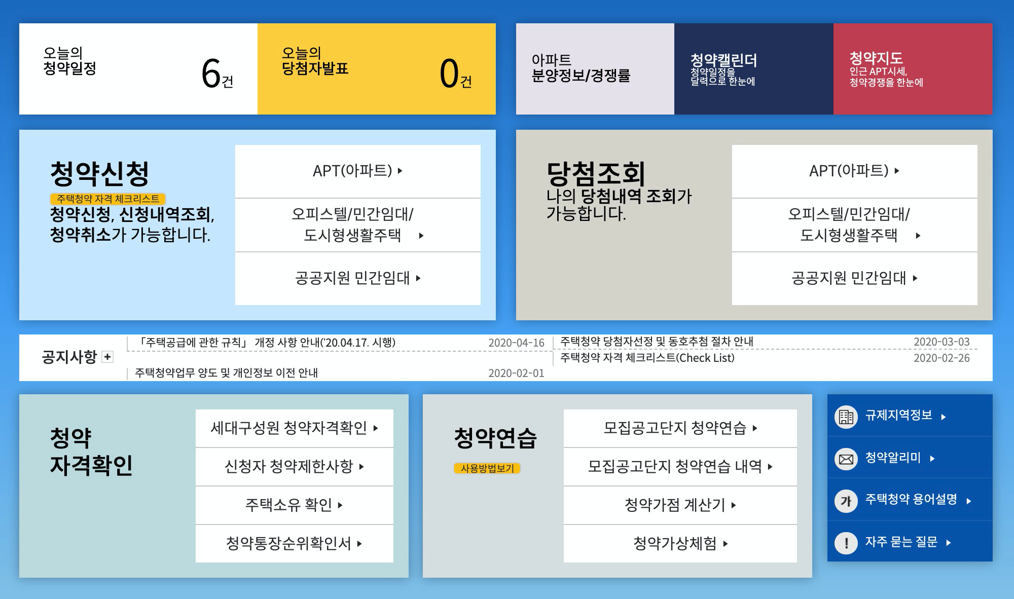 여기로 들어가시면 아파트 청약 홈페이지로 들어가실 수 있습니다. 여기로 들어가면 청약 신청이 가능하고, 청약 당첨 조회가 가능합니다. 또한 청약자격확인이 가능하여 본인이 지원을 할 수 있는지 없는지를 체크도 가능하지요. 이 외에도 청약과 관련된 다양한 정보를 얻을 수 있습니다.