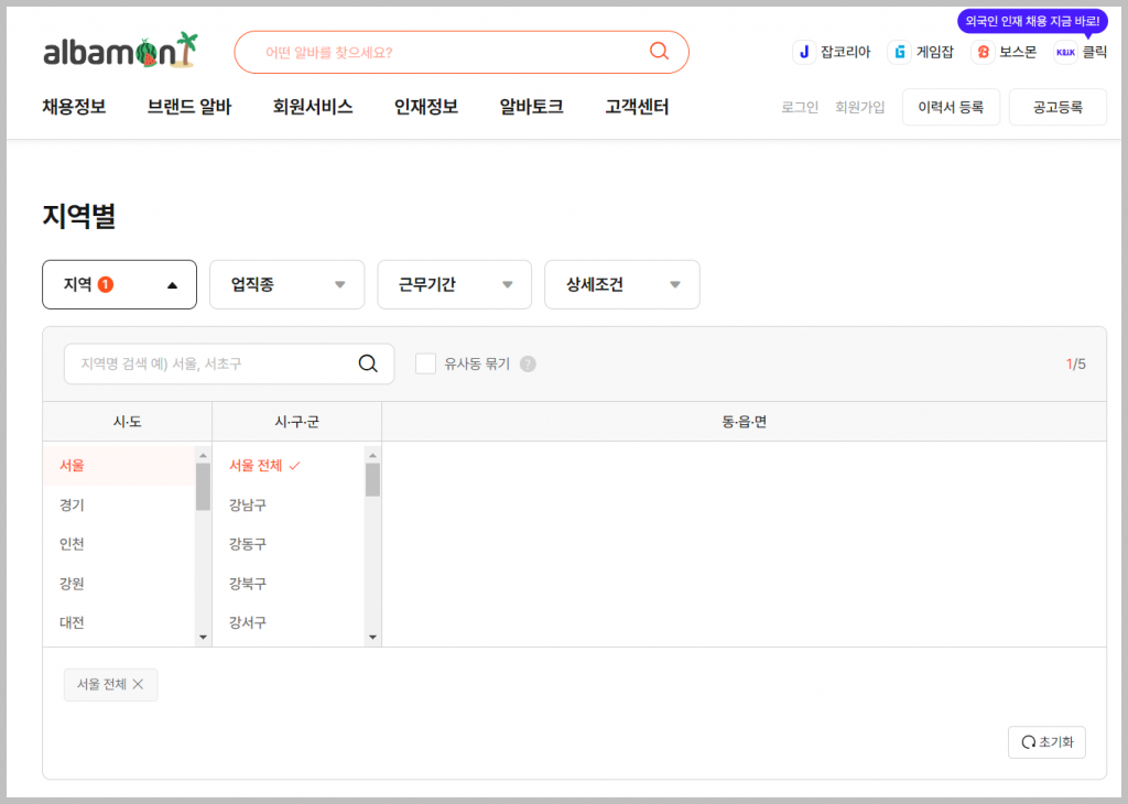 이후 원하는 지역을 상세하게 선택하여 들어가면 됩니다. 지역에 따라 아르바이트 정보가 크게 달라지는데, 어떤 곳은 기회가 많지만, 어떤 곳은 심각할 정도로 적을 수 있습니다. 해당 지역에 아르바이트가 없는 경우, 인근으로 옮겨서 찾는 것도 좋은 방법입니다.