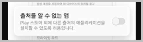 위 사진과 같이 설정 메뉴에 접속한 이후, '출처를 알 수 없는 앱' 허용 옵션을 체크하면 외부 apk 파일을 설치할 수 있습니다. 이걸 허용해야지만 다른 출처의 앱을 다운받을 수 있습니다. 설치 후에는 보안을 위해 이 설정을 다시 끄는 것이 중요합니다.