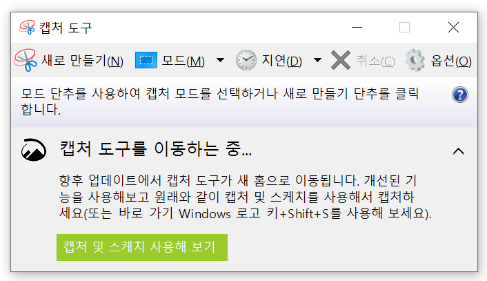 캡처도구는 전통적인(?)방법의 영역 캡쳐 프로그램입니다. 하지만 지금은 권장되고 있는 방식이 아닙니다. 마이크로소프트는 캡처 도구에 여러 기능을 추가해서 캡처 및 스케치를 사용을 권장하고 있습니다.