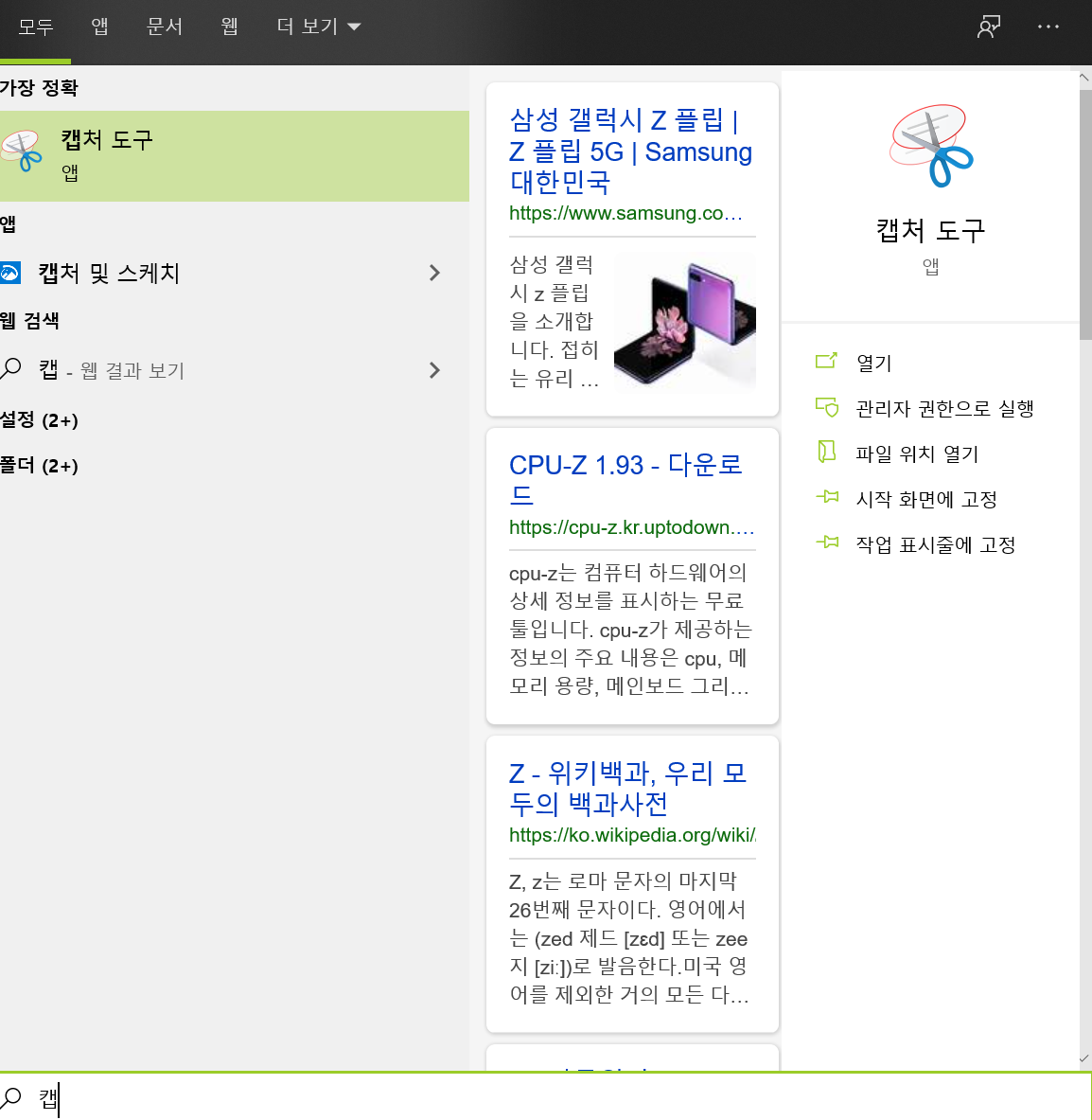 캡처도구는 좌측하단 검색창에 '캡처도구'라고 검색을 하면 나옵니다. 중요한것은 캡'쳐'가 아니라 캡'처'입니다. 정확하게 쳐야지 나옵니다. 이건 단축키가 없어서 많이 불편합니다.