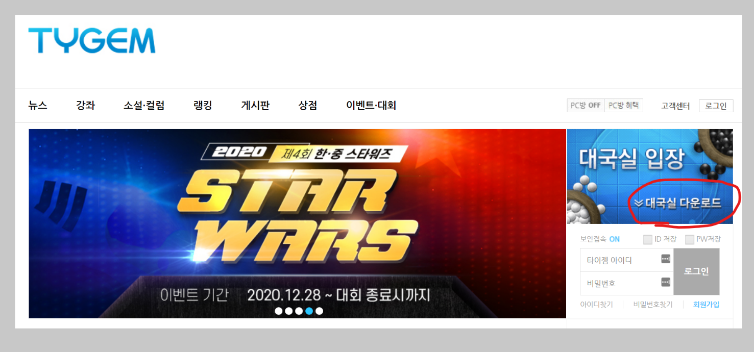 홈페이지에 들어가면 위와같은 화면이 나오는데, 우측에 있는 대국실 다운로드를 클릭을 하면 타이젬 바둑 다운받기가 가능합니다. 다운만 받는 다고 모든것이 다 해결이 되는것이 아니라, 설치를 해야지 이용이 가능합니다.