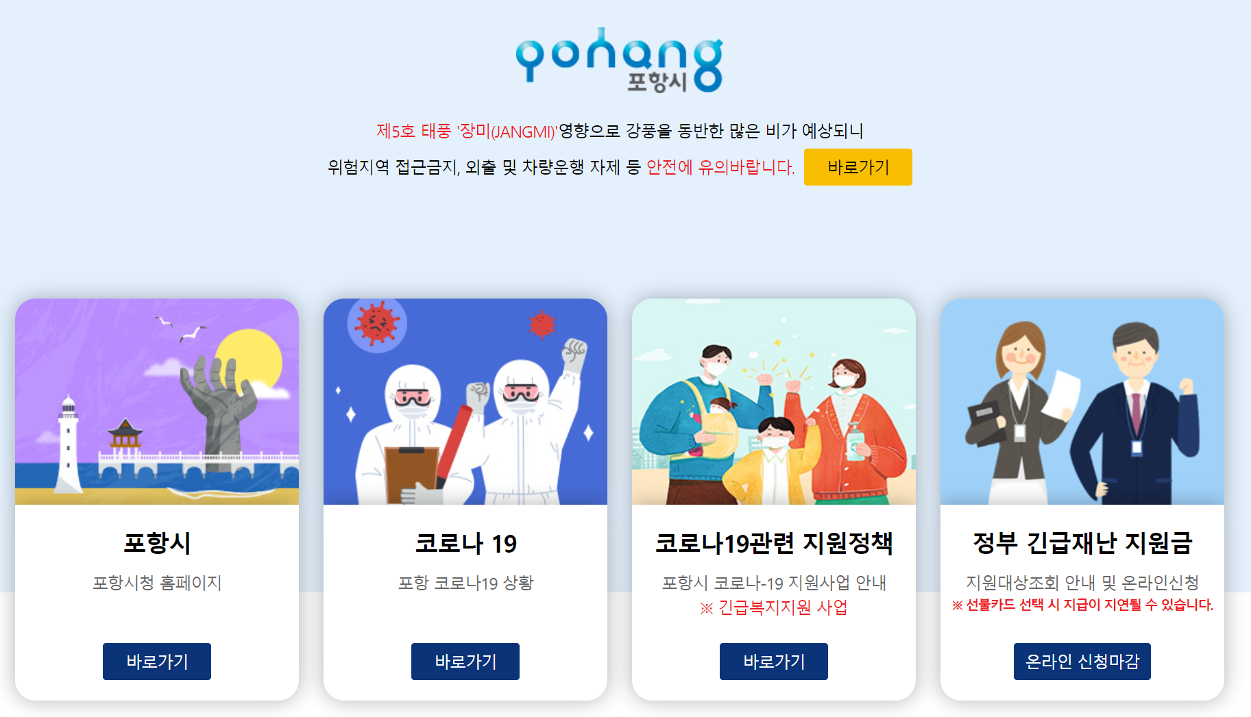 가장 왼쪽은 포항시청 홈페이지로 들어갈수 있으며, 두번째는 코로나19 상황을 확인 할수 있습니다. 세번째 바로가ㅣㄴ느 코로나19와 관련된 지원정책이 있습니다.