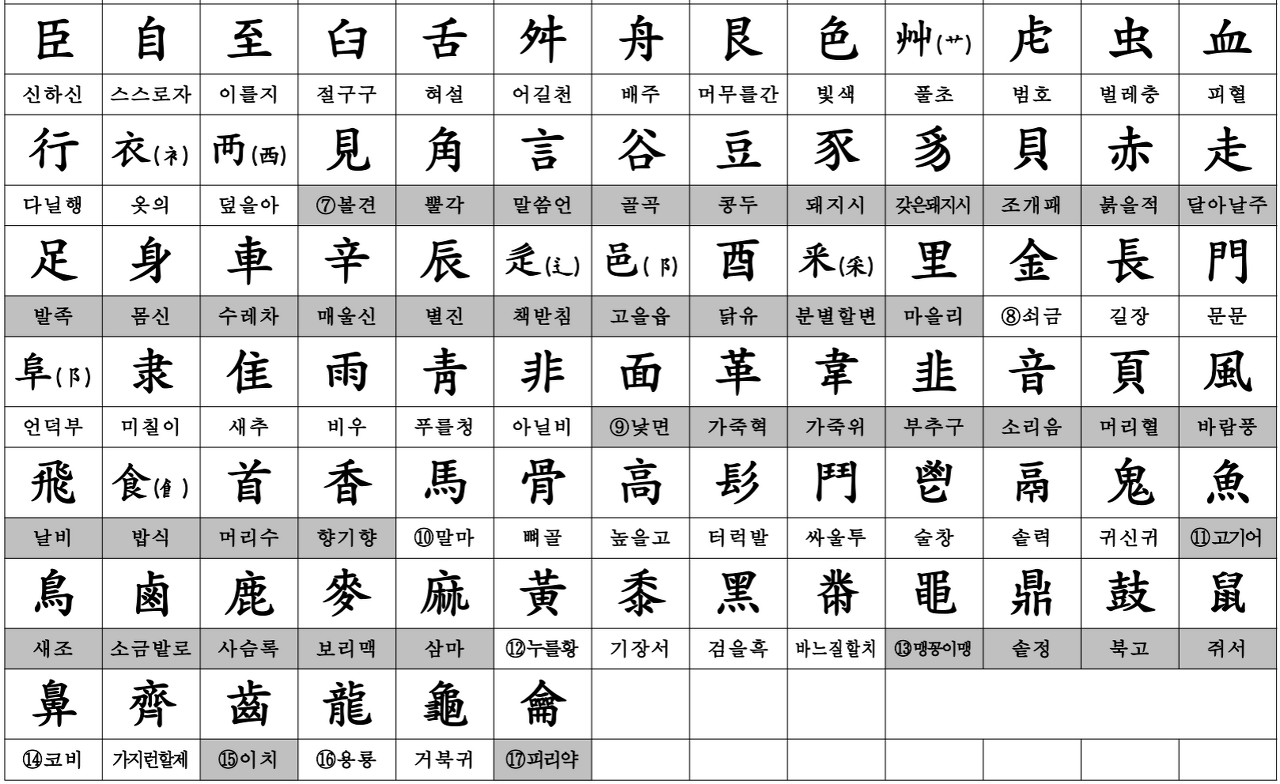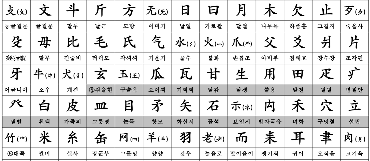 아래는 강희자전 방식의 한자 부수 214자표를 정리해둔 표 입니다.