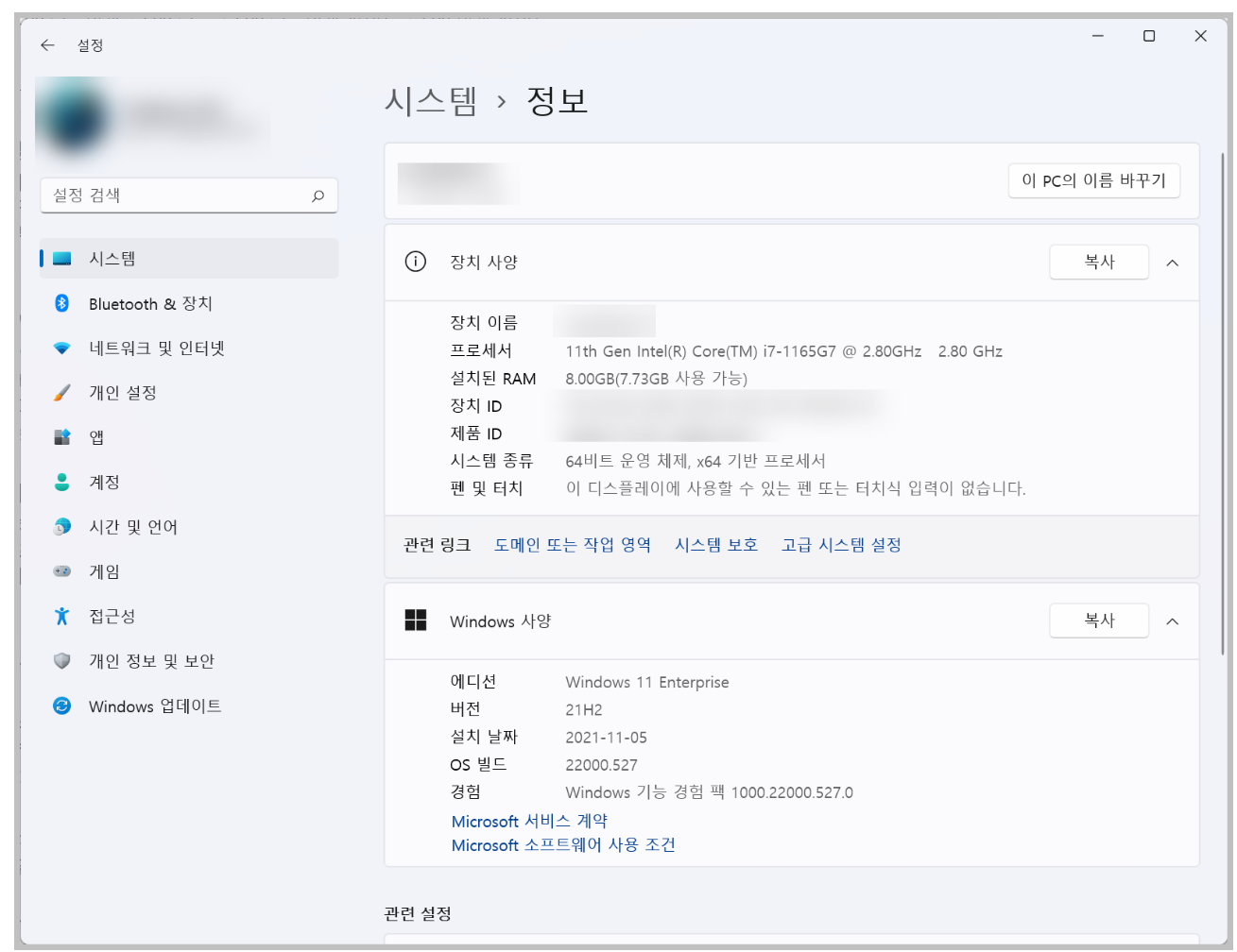 '시작->제어판->시스템'으로 들어가시면 본인이 사용하고 있는 컴퓨터에 대한 기본적인 장치 사양을 쉽게 확인할 수 있습니다. 저같은 경우에는 11세대 인텔 1165G7 프로세서를 사용하고 있고 램은 8GB 짜리를 이용하고 있네요. 하지만 여기에는 최소한의 정보만 확인을 할수 있고 구체적인 정보는 확인하기 어렵습니다. 기껏해야 CPU 종류와 램이 몇기가 정도인지만 확인할 수 있습니다.