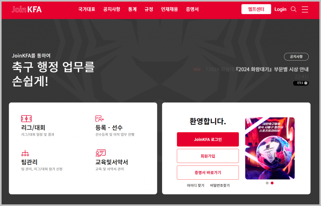 이 시스템을 기반으로 팀과 선수 등록, 이적 등 다양한 행정 처리를 전산화하여 동호인들에게 제공하고 있습니다. 아래 링크를 통해 해당 사이트로 접속할 수 있습니다. 사이트 주소는 http://www.joinkfa.com/ 입니다.