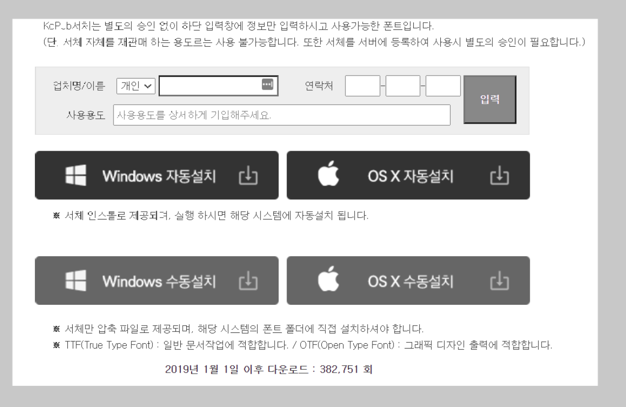 이름과 연락처 사용용도를 기입을 해주고 설치를 하면 됩니다. 하지만 기입을 하지 않더라도 폰트 다운로드는 가능합니다. 자동설치 버전과 수동설치 버전이 있는데 원하는 것을 선택하시면 됩니다.