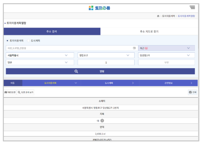 이 사이트에 들어가서 주소하나를 검색하면 위와 같은 화면이 나오게 됩니다. '토지이음'은 데이터가 변동될 때마다 즉시 이해하기 쉬운 국토이용정보를 제공하고 있습니다. 과거, 현재 뿐만 아니라 미래의 규제정보와 도시계획정보까지도 '토지이음'을 통해 열람이 가능합니다.